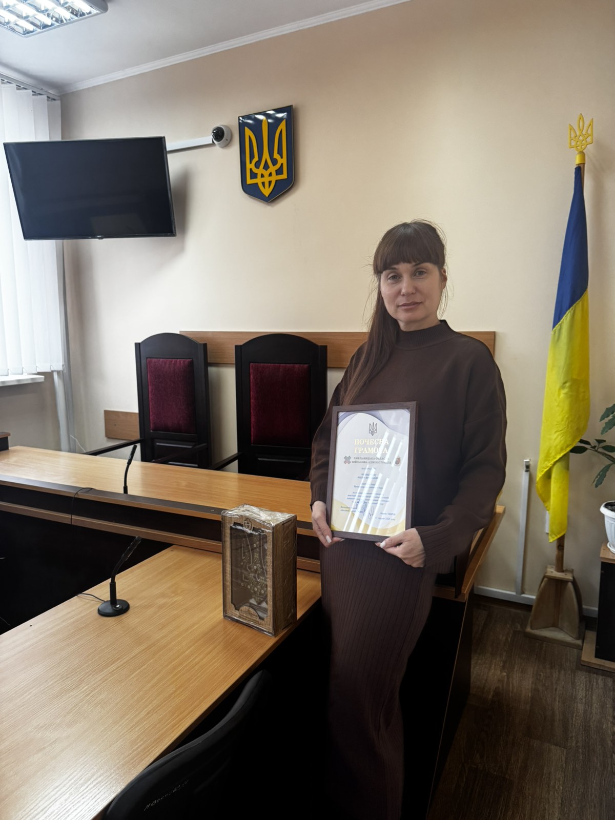 За сумлінне виконання службових обов’язків, високий професіоналізм, вагомий особистий внесок у забезпечення правосуддя та з нагоди Дня працівників суду Почесною грамотою Хмельницької обласної військової адміністрації нагороджено помічника судді Кочмарську Олесю Миколаївну.